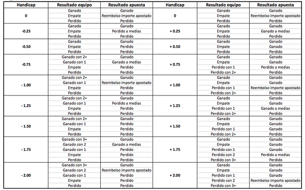 Sin duda el hándicap asiático es uno de los conceptos que más dudas generan entre los apostadores que están empezando en el sector. Por este motivo, adjuntamos una tabla muy completa en la que te explicamos todo tipo de supuestos para una fácil asimilación. Ten en cuenta que el hándicap asiático está presente en numerosos mercados y eventos, así que es imprescindible comprender su significado para aumentar las probabilidades de acierto en tus apuestas deportivas. Ahora solo te queda estudiar la tabla y empezar a aplicarla en tus apuestas diarias. ¿Estás preparado para hacerlo?